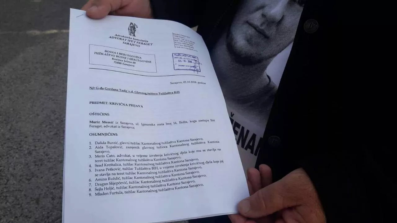SARAJEVO, (Patria) - Muriz Memić, otac ubijenog mladića Dženana Memića sa svojim advokatom Ifetom Feragetom danas je predao krivičnu prijavu Gordani Tadić, v.d. glavne tužiteljice Tužilaštva BiH protiv 46 osoba među kojima je na prvom mjestu glavna tužiteljica Tužilaštva KS Dalida Burzić.