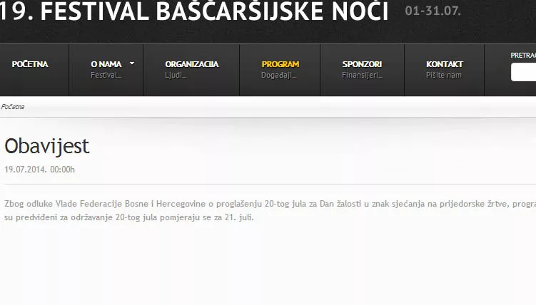 - Zbog odluke Vlade Federacije Bosne i Hercegovine o proglašenju 20-tog jula za Dan žalosti u znak sjećanja na prijedorske žrtve, programi Festivala Baščaršijske noći koji su predviđeni za održavanje 20-tog jula pomjeraju se za 21. juli – kažu organizatori.
