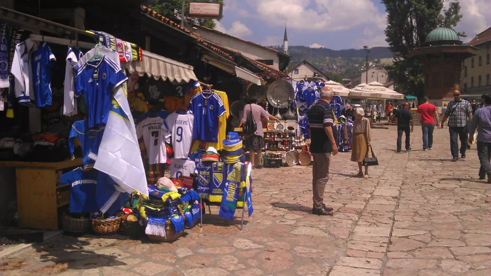 Na Baščaršiji veliki broj turista obilazi znamenitosti, a prodavač navijačkih rekvizita kaže za NAP da prodaja nikada nije bila bolja.