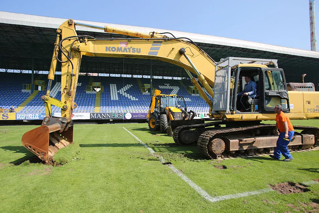 Tokom dana je uklonjen veći dio podloge, međutim još uvijek je neizvjesno da li će novi travnjak biti postavljen do prve evropske utakmice plavih.