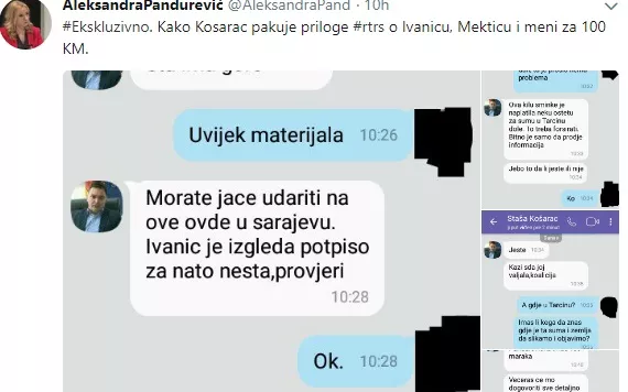 Zastupnica Pandurević prepisku između Košaraca i novinara RTRS-a objavila je na svom Twitter nalogu.
