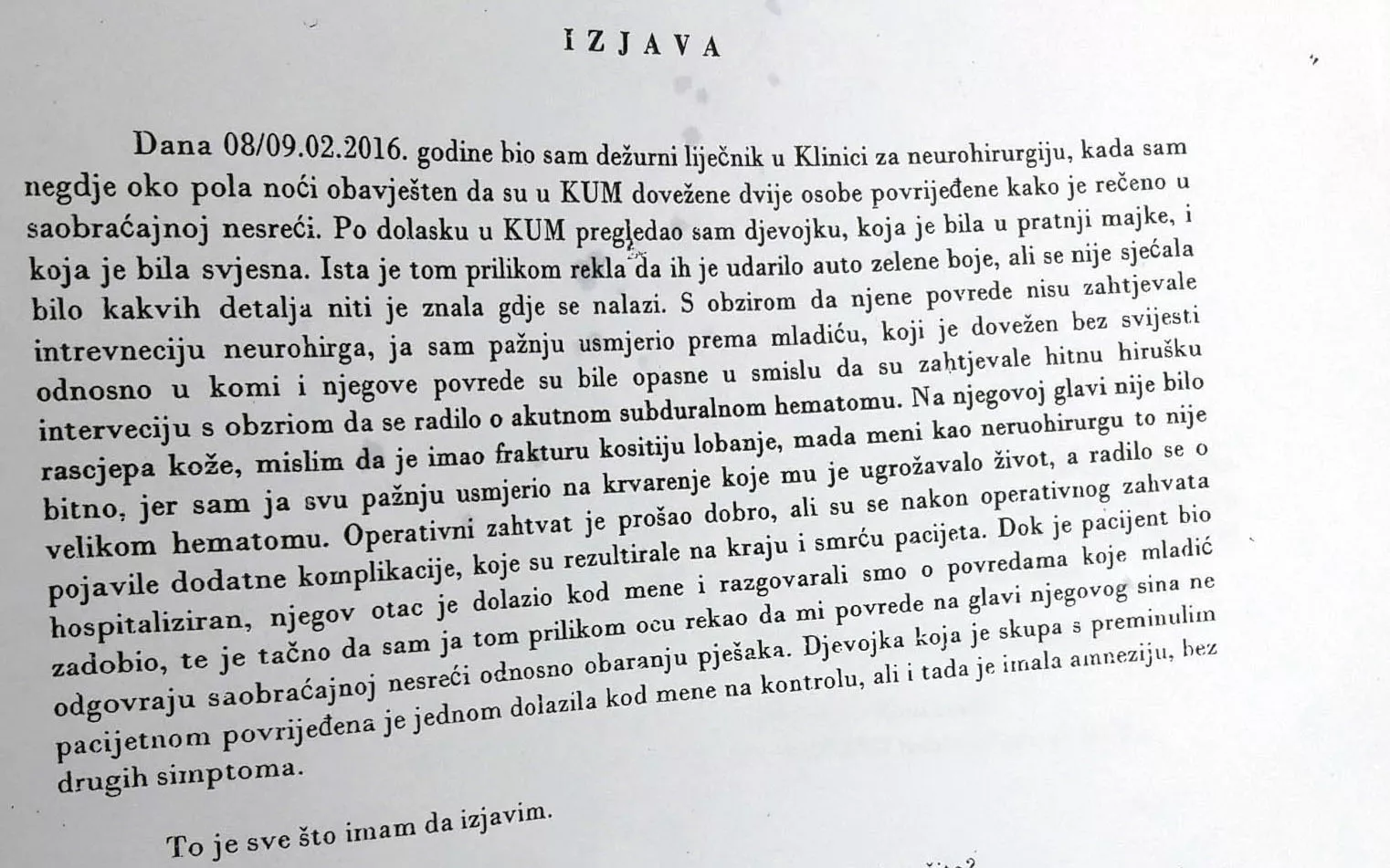 - Molim sud da cijeni ogroman značaj ovog dokaza i da je to jedini ljekar koji je dao informacije o stanju i povredama Dženana Memića – kazao je Karkin u obraćanju sudskom vijeću prije jučerašnjeg nastavka suđenja.