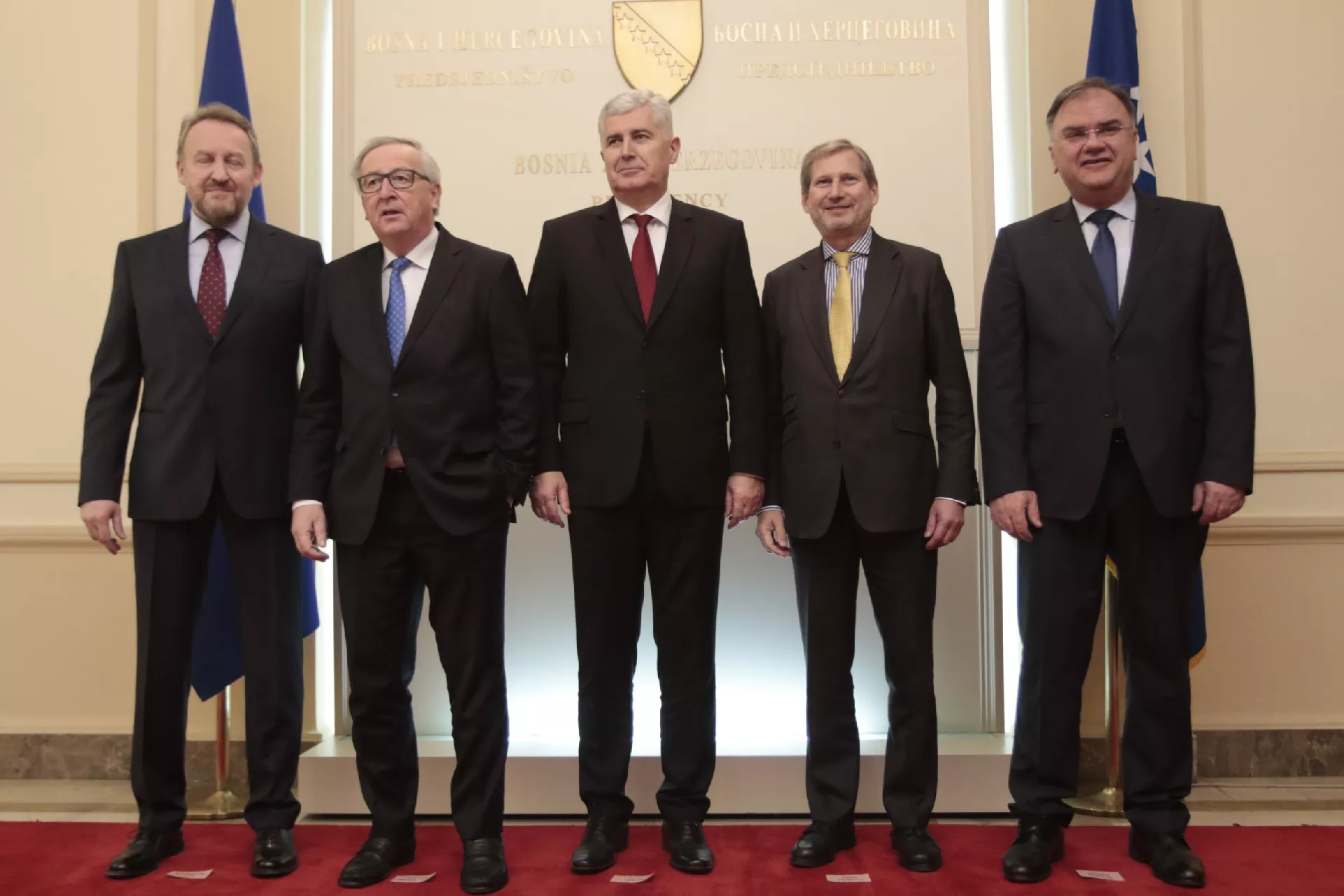 SARAJEVO, (Patria) - Predsjedavajući Predsjedništva BiH Dragan Čović i članovi Predsjedništva Mladen Ivanić i Bakir Izetbegović primili su Jean-Claudea Junckera i Johannesa Hahna u zgradi Predsjedništva BiH.