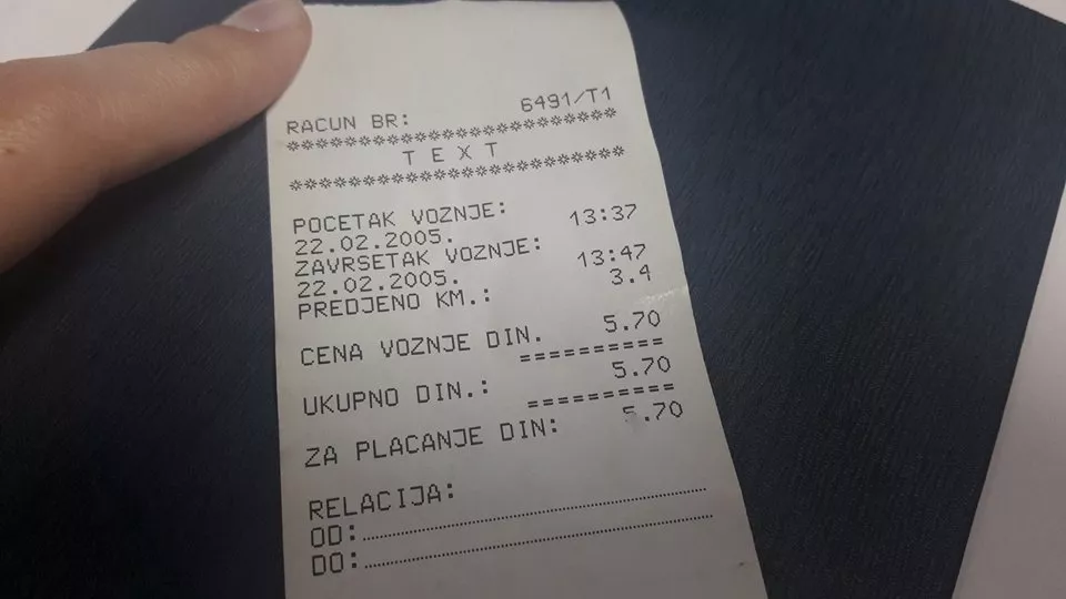 No, zanimljiva situacija dogodila se u jednom od taksija gdje je vozač na pitanje da li može izdati račun vrlo ljubazno to i učinio. Naime, datum na izdatom računu je 22.02.2005. godine, a cijena je izražena u dinarima umjesto u konvertibilnim markama!