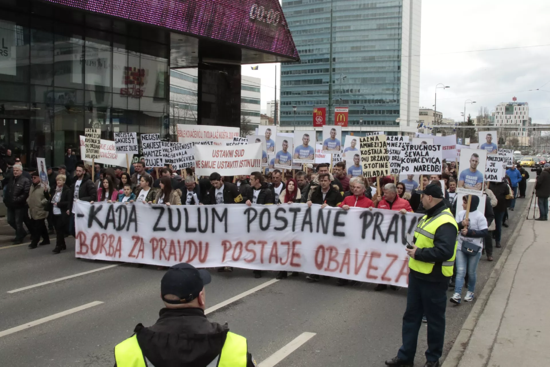 Učesnici protesta oko ruku imaju žute trake sa likom nastradalog Dženana kao i transparent na kojem piše: "Kada zulum postane pravilo, borba za pravdu postaje obaveza".