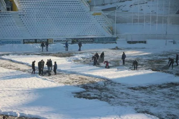 Organizatori od ranih jutarnjih sati čine sve kako bi uklonili snijeg i teren osposobili za odigravanje utakmice.