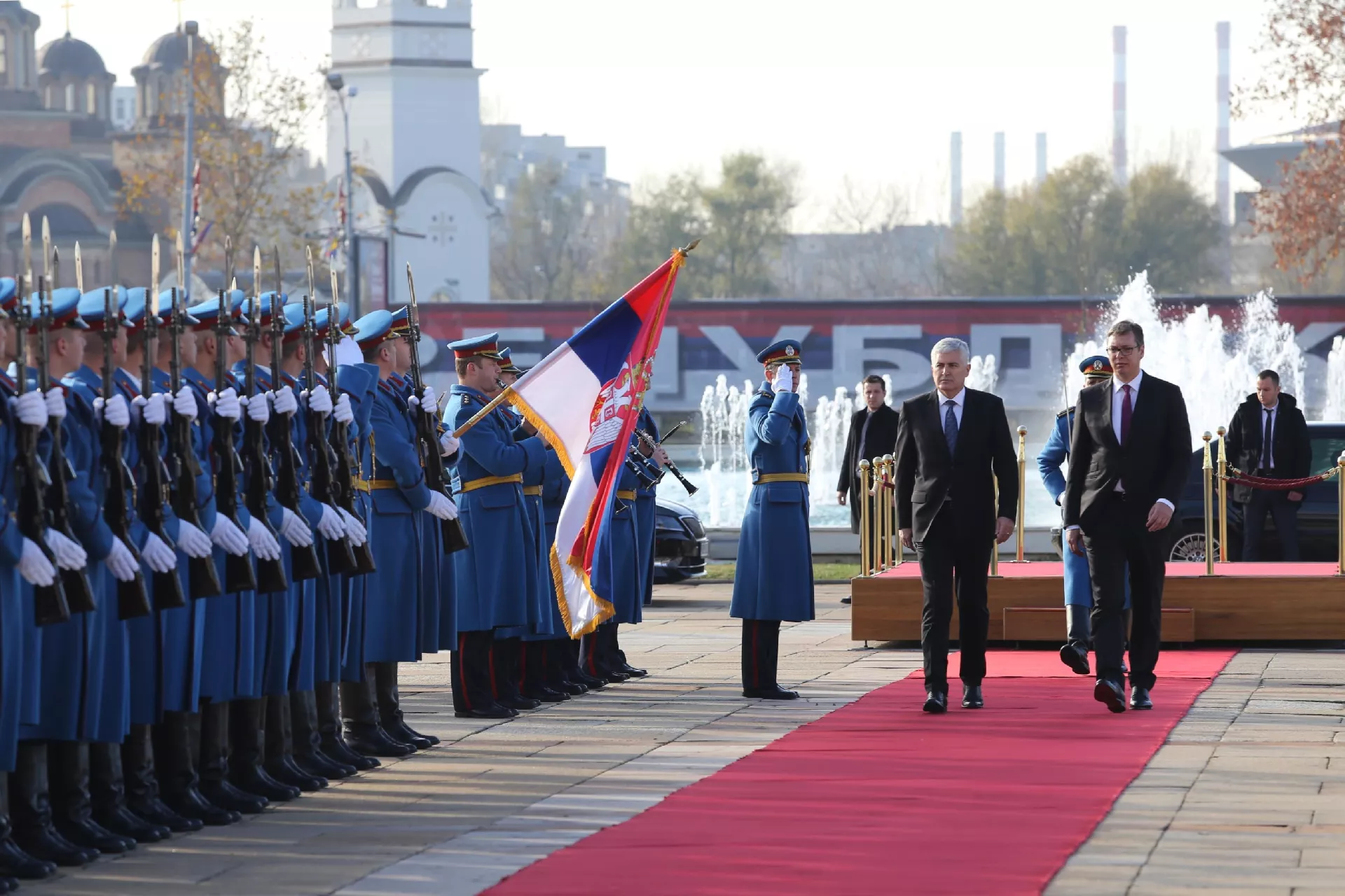 BEOGRAD, (Patria) - Predsjednik Srbije Aleksandar Vučić priredio je danas, ispred Palate Srbija, svečani doček uz državne i vojne počasti članovima Predsjedništva Bosne i Hercegovine Draganu Čoviću, Bakiru Izetbegoviću i Mladenu Ivaniću.