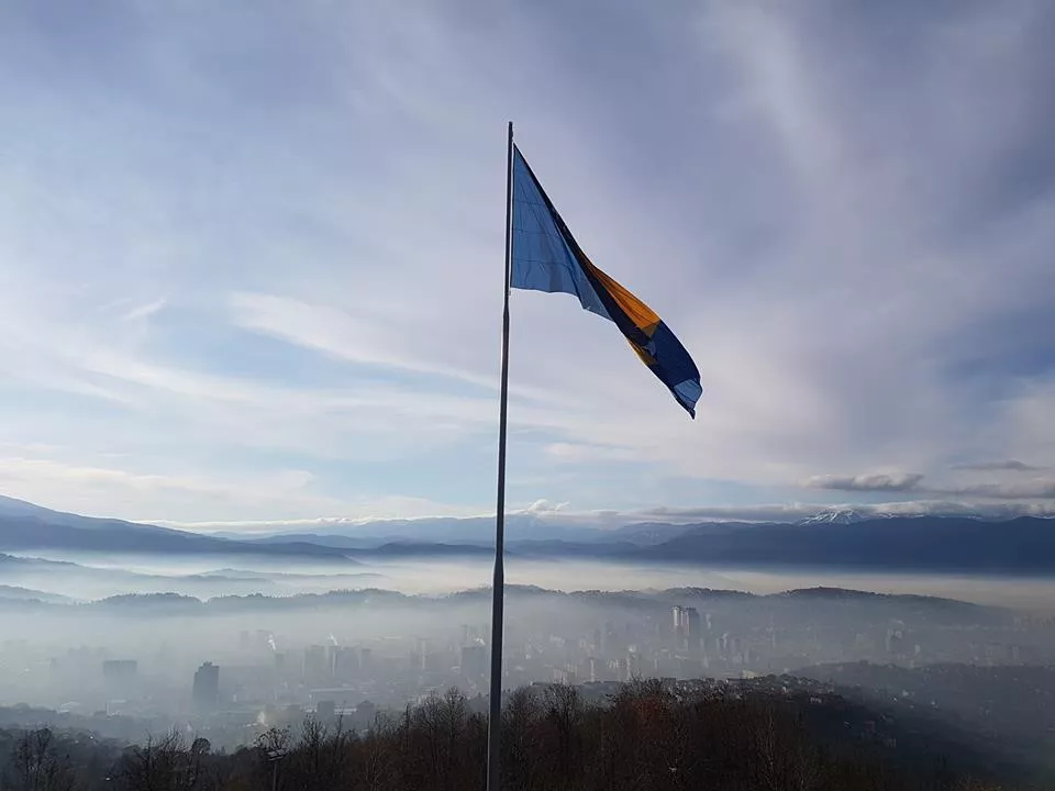 Najveća zastava Bosne i Hercegovine podignuta je jutros na brdu Hum iznad Sarajeva.