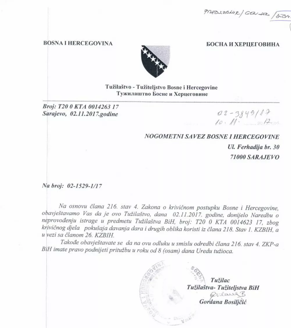 U NS/FSBiH je u proteklim danima stigla još jedna obavijest od strane Tužilaštva Bosne i Hercegovine o donošenju Naredbe o neprovođenju istrage, br. T20 0 KTA 0014263 17 od dana 02.11.2017. godine, a koja je izdata nakon svih izvšenih provjera na osnovu zaprimljenih prijava.