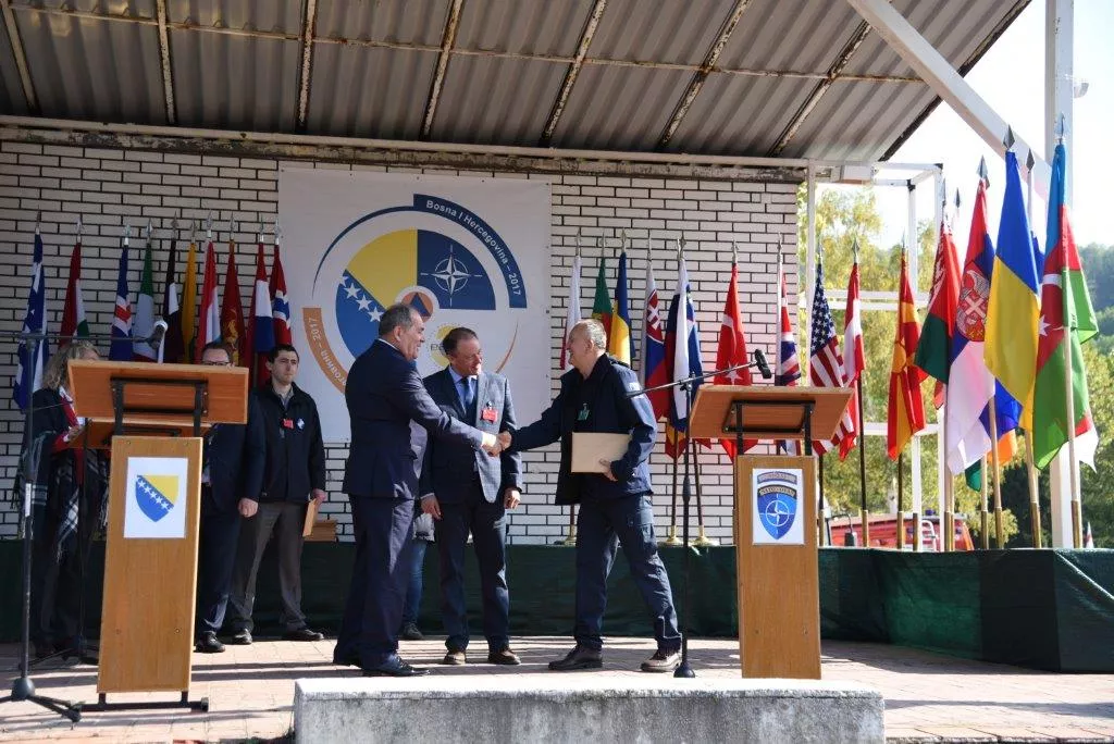 Ceremonija zatvaranja NATO vježbe upravljanja posljedicama elementarnih nepogoda ”BOSNA I HERCEGOVINA 2017” je završena uručenjem certifikata učesnicima vježbe iz 35 zemalja.