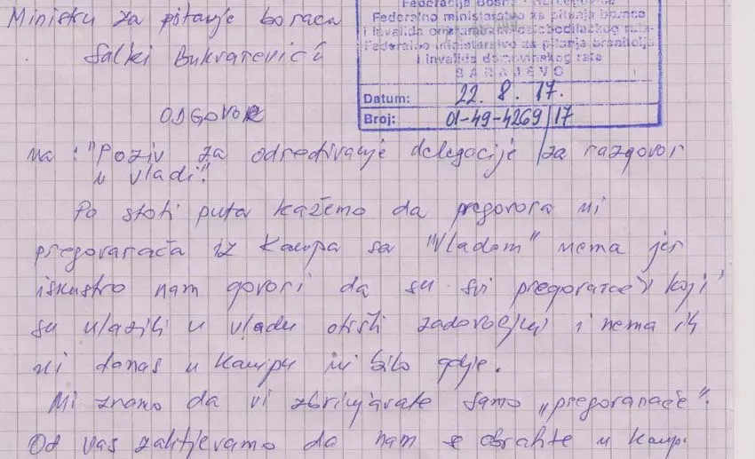 - Po stoti put vam kažemo da pregovora niti pregovarača iz Kampa sa Vladom nema, jer iskustvo nam govori da su svi pregovarači koji su ulazili u Vladu otišli zadovoljni i nema ih danas u kampu ni bilo gdje. Mi znamo da vi zbrinjavata samo “pregovarače” . Od vas zahtijevamo da nam se obratite u Kampu najkasnije do 22 sata u srijedu. U protivnom štrajk glađu se nastavlja od četvrtka – stoji u pismu.