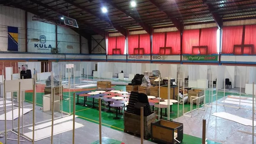 Radnici firme BOMS-expo Gračanica postavljaju montažnu halu na platou Gradačačkog sajma i uređuju izložbene prostore u sportskoj dvorani zae oko 300 izlagača iz BiH i inostranstva koji su najavili dolazak na ovu tradicionalnu privrednu manifestaciju.