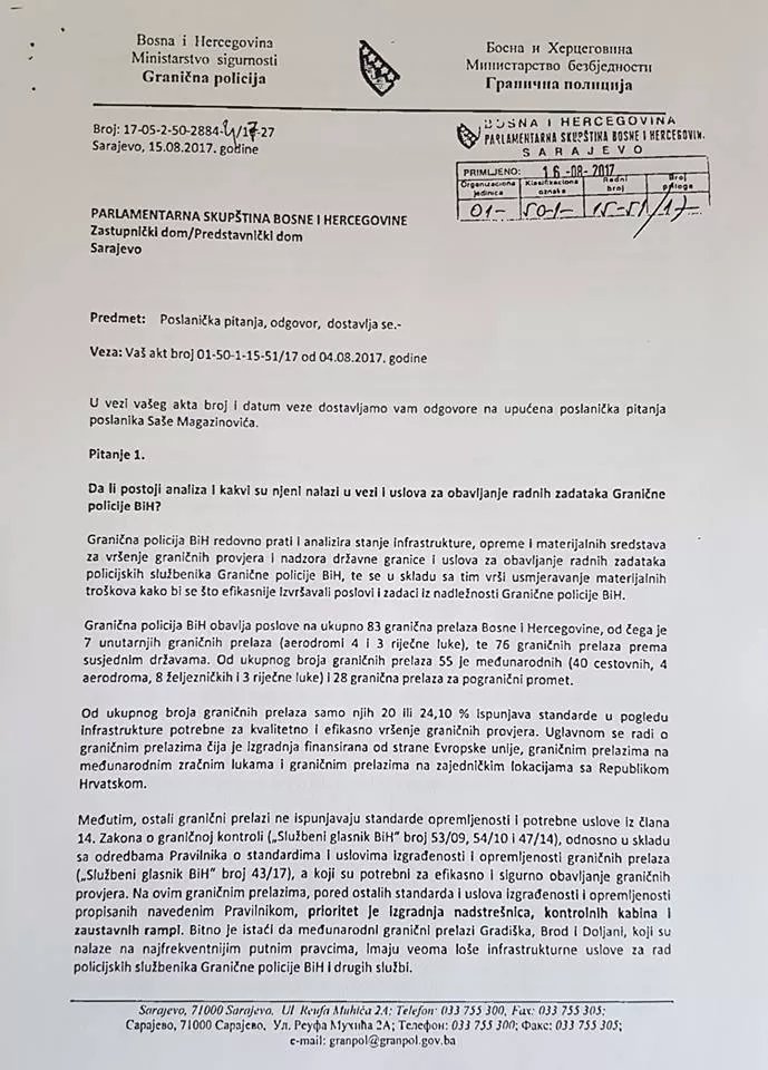 U odgovoru se, između ostalog navodi, da se redovno analizira stanje infrastrukture, opreme i materijalnih sredstava za vršenje graničnih provjera i nadzora državne granice, kao i uslova za obavljanje radnih zadataka policijskih službenika GP BiH, te da manje od 25 posto graničnih prelaza ispunjava standarde u pogledu infrastrukture.