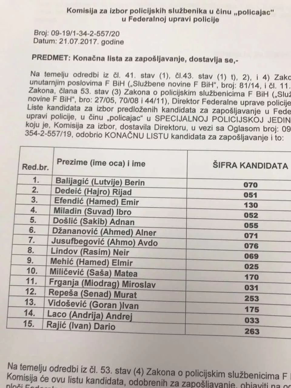 Lukač je listu napravio prije nego je Policijski odbor razmatrao žalbe. Inače, Policijski odbor do petka 18. avgusta ima rok da se izjasni o pristiglim žalbama. Podsjećamo, da je identičan scenario bio i na prošlom konkursu koji je na kraju poništen.