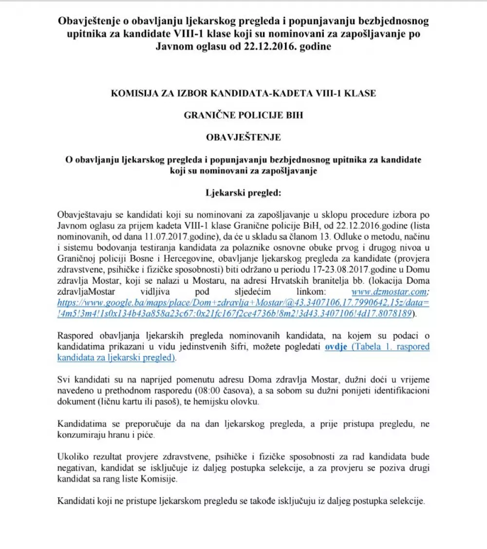 Menadžment Granične policije BiH donio je odluku da se ponovi ljekarski pregled i to u Domu zdravlja u Mostaru!