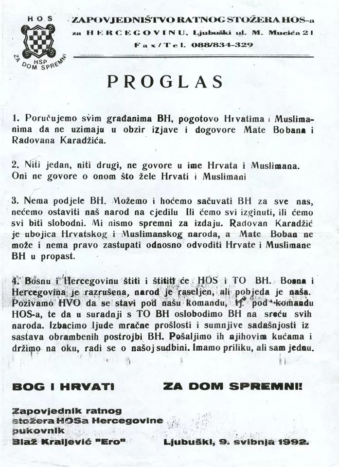 - Bosnu i Hercegovinu štiti i štitit će HOS i TO BiH. Bosna i Hercegovina je razrušena, narod je raseljen, ali pobjeda je naša. Pozivamo HVO da se stavi pod našu komandu, tj. pod komandu HOS-a, te da u suradniji s TO BiH oslobodimo BiH na sreću naroda. Izbacimo ljude mračne prošlosti i sumnjive sadašnjosti iz sastava odbrambenih postrojbi BiH. Pošaljimo ih njihovim kućama i držimo na oku, radi se o našoj sudbini. Imamo priliku, ali samo jednu."