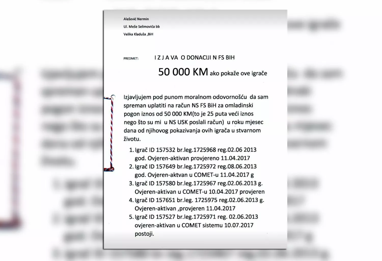 Nermin Alešević je nakon toga kod notara ovjerio dokument u kojem se obavezuje da će na račun NS BiH uplatiti 50.000 KM ukoliko mu neko pokaže igrače koje je problematizirao, odnosno za koje je naveo da se nalaze u takozvanom Comet sistemu sa lažnim podacima. Comet je ukratko međunarodni napredni aplikacijski sistem za evidenciju svih podataka, te automatizaciju svih procesa vezanih za pripremu, vođenje i praćenje nogometnih takmičenja.