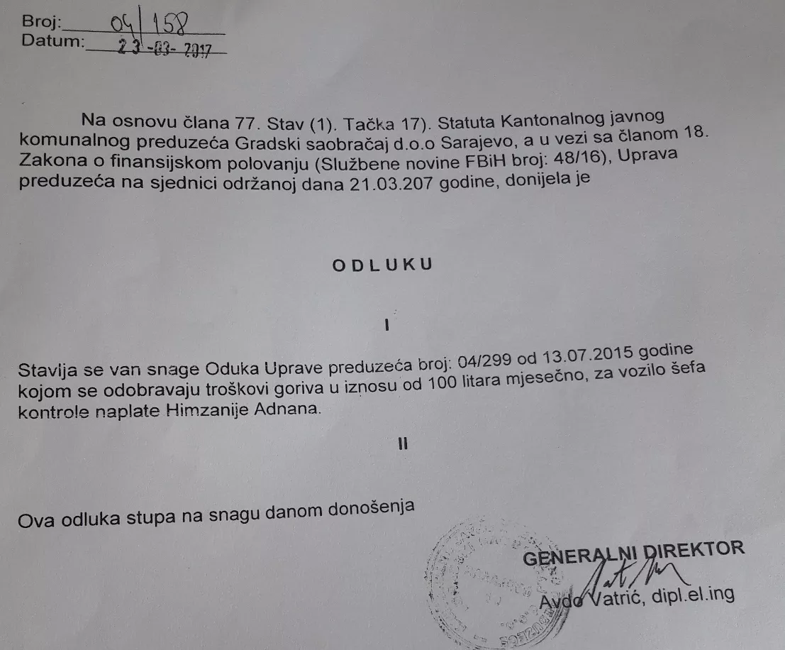 Sada smo došli i u posjed dokumenta u kojem je Avdo Vatrić, bivši direktor GRAS-a stavio van snage „Odluku Uprave preduzeća od 13. jula 2015. godine kojom se odobravaju troškovi goriva u iznosu od 100 litara mjesečno, za vozilo šefa naplate Himzanije Adnana“. Odluka je stavljena van snage 23. marta 2017.