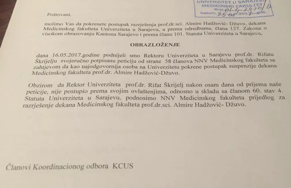 Koordinacioni odbor KCUS-a uputio je Nastavno-naučnom vijeću Medicinskog fakulteta u Sarajevu prijedlog za razrješenje dekanese Almire Hadžović-Džuvo, a u obrazloženju se pozivaju na peticiju od 58 članova NNV-a. No, uz današnji zahtjev nalazi se 16 potpisa članova Koordinacionog odbora KCUS-a, od kojih su njih 10 članovi NNV-a i potpisnici prve peticije, piše agencija Patria.