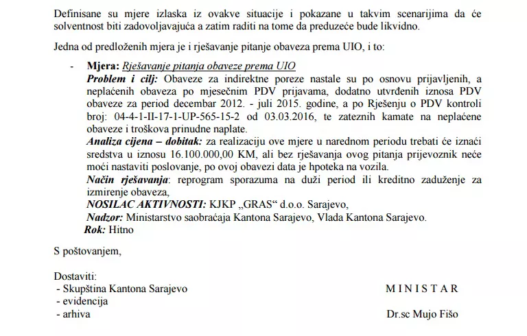 Također, navedeno je da bi način rješavanja bio reprogram sporazuma na duži period ili kreditno zaduženje za izmirenje obaveza s tim da je nosilac aktivnosti GRAS. No, izvjesno je da UIO BiH želi naplatiti dug te da vremena za čekanje više nema.