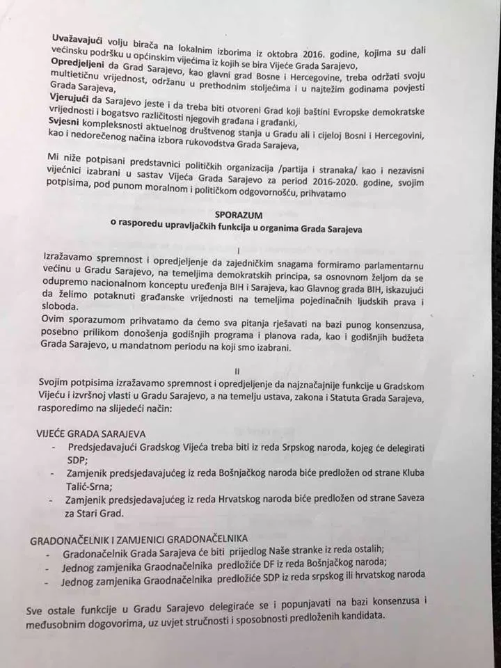 Šest predstavnika stranaka ljevice potpisalo je sinoć kasno sporazum o rasporedu pozicija u Gradskom vijeću i Gradskoj upravi Grada Sarajeva. Za današnju konstituirajuću sjednicu novog saziva Vijeća ljevica je osigurala svojih 14 vijećnika, piše Patria.