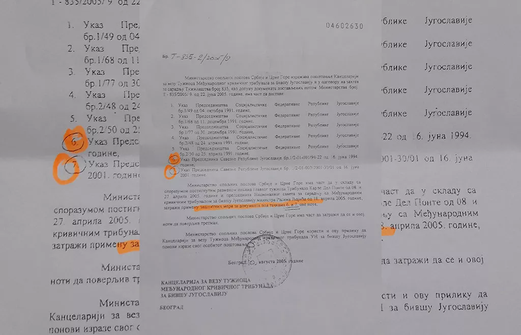 Prije 12 godina, u avgustu 2005. godine bivše Ministarstvo vanjskih poslova Srbije i Crne Gore dostavilo je na zahtjev Haškog tužilaštva sedam dokumenata-ukaza Predsjedništva SFRJ i predsjednika Savezne Republike Jugoslavije.
