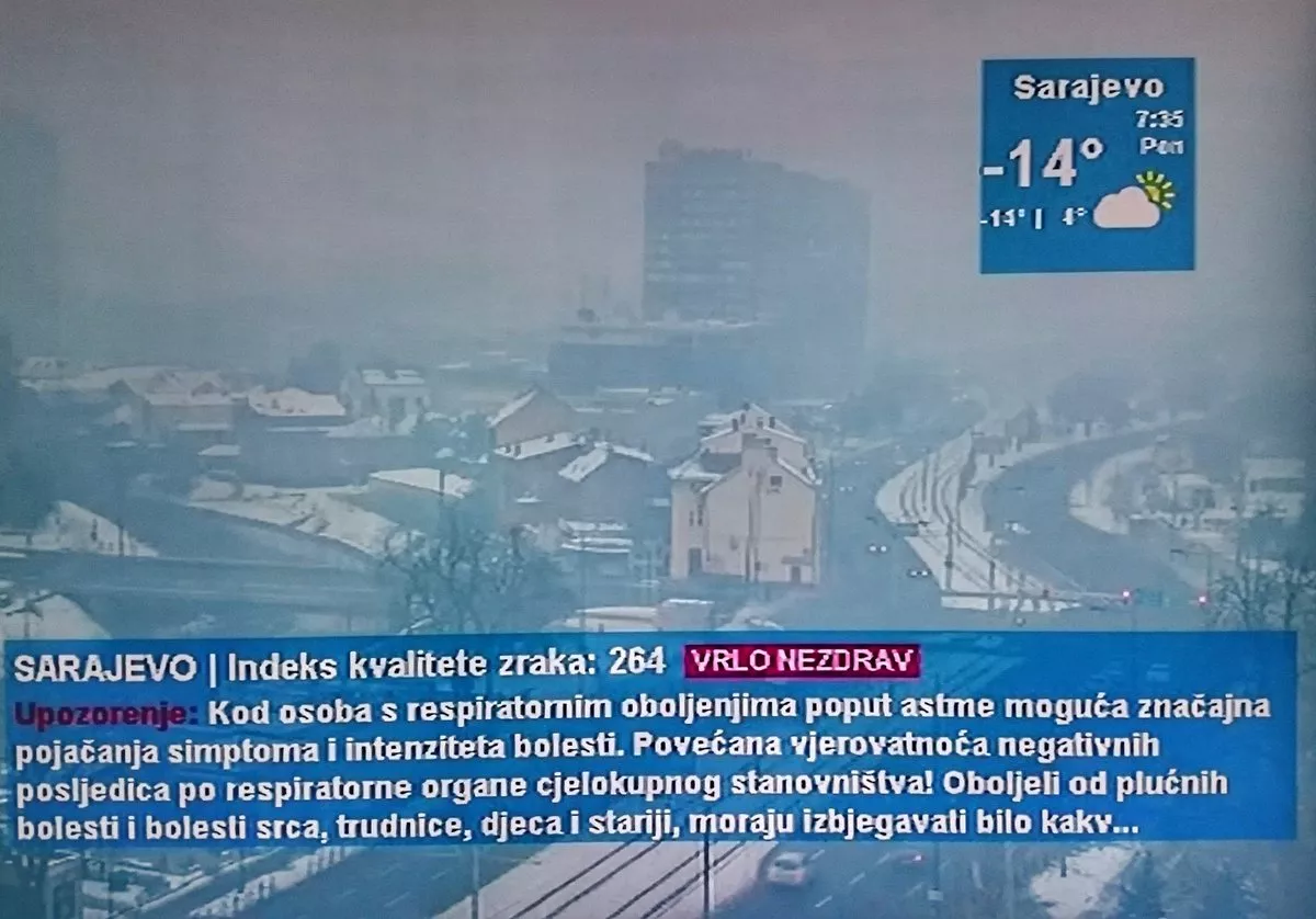 Zrak u Sarajevu ponovo je nezdrav, a jutros je indeks kvalitete bio 264. Preporuka je smanjiti kretanje, a kod astmatičara i osoba sa respiratornim smetnjama moguće je pogoršanje simptoma i intenziteta bolesti, piše bh. novinska agencija Patria.