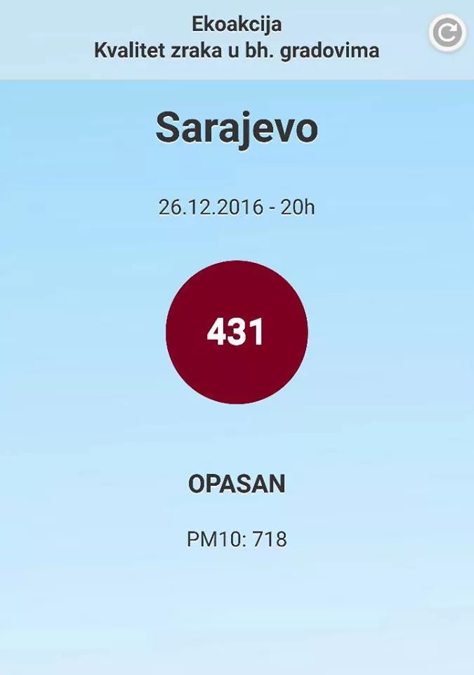 Večeras u 19 sati u Sarajevu je zabilježeno do sada najveće zagađenje zraka. Indeks kvalitete zraka je 427, što je prema podacima Udruženja Eko akcija definisano kao OPASNO. Samo sat kasnije indeks je bio 431, piše Patria.