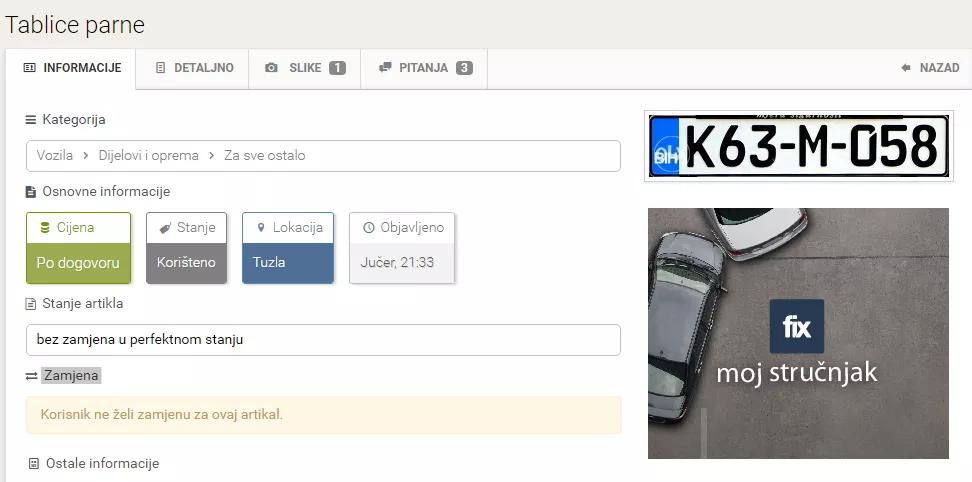 Nakon što je Vlada Kantona Sarajevo donijela odluku da zbog enormnog zagađenja u Kantonu Sarajevo uvede sistem vožnje za automobile par-nepar, na olx.ba pojavila su se dva oglasa za prodaju registarskih tablica, piše Patria.