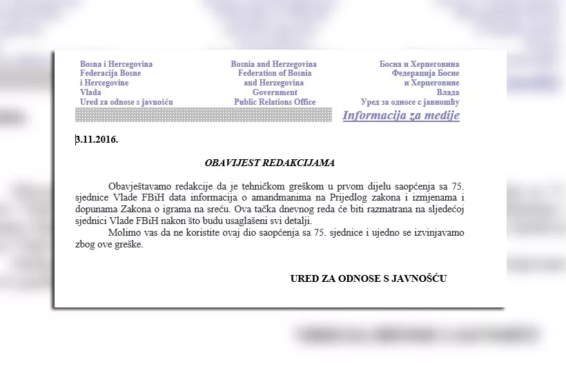 Vrlo brzo iz Vlade je stiglo novo saopćenje u kojem se navodi da je došlo do greške jer je data informacija o amandmanima na Prijedlog zakona i izmjenama i dopunama Zakona o igrama na sreću.