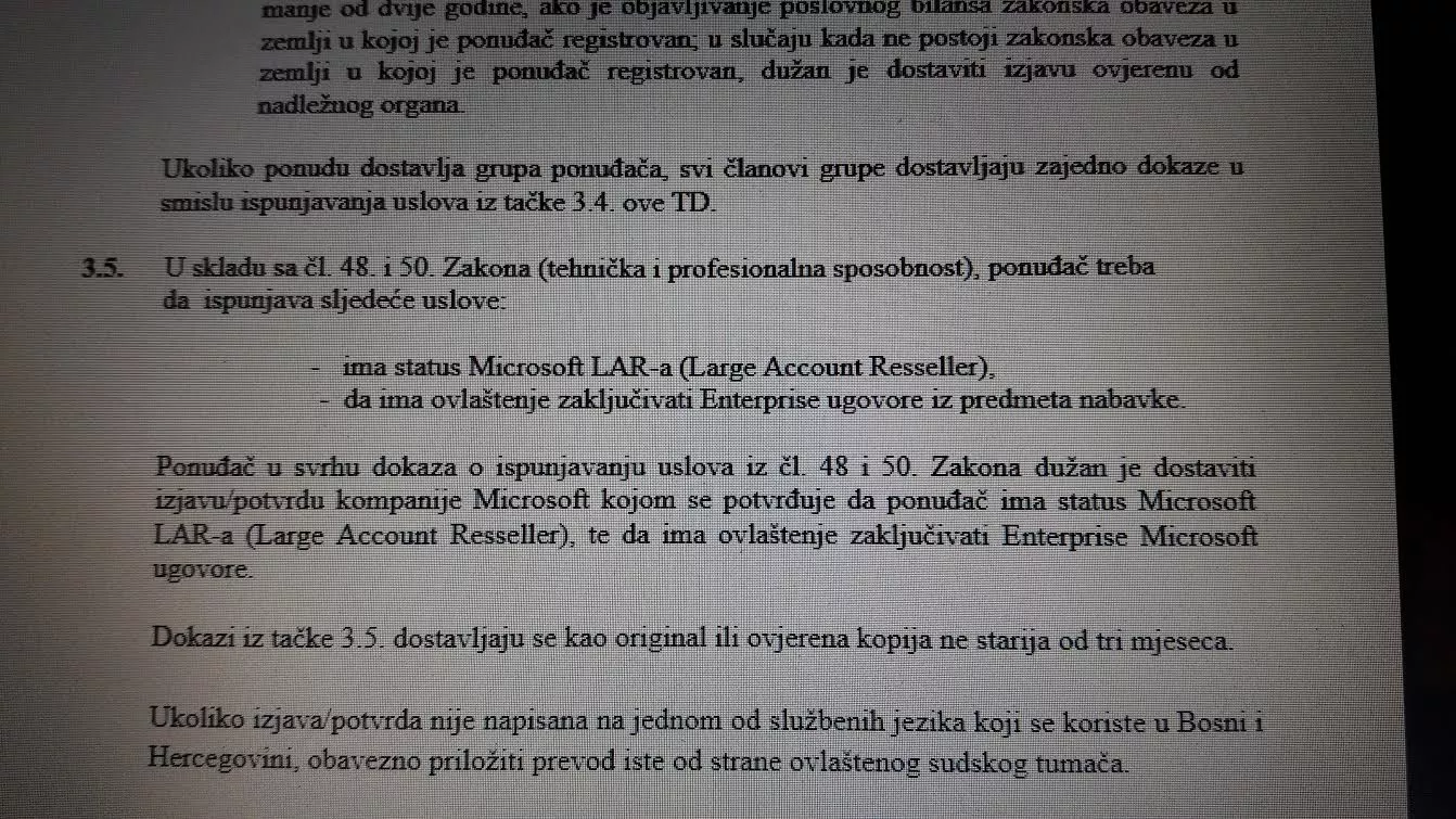 U BiH ima oko 150 Microsoftovih partnera. Ali niti jedan od njih ne može ponuditi uslove pod kojim bi nabavio Microsoftove licence za potrebe institucija BiH. Eliminisani su tačkom 3.5. ovog tendera, piše Patria.