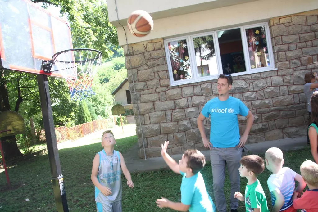 Među aktivnijim je u grupi, kaže da mu se sviđa košarka i nestrpljiv je da ponovo šutira prema košu. Igra se na koševima koje su organizatori donijeli za potrebe radionice, a iza vrtića su stari koševi koji nemaju obruč.