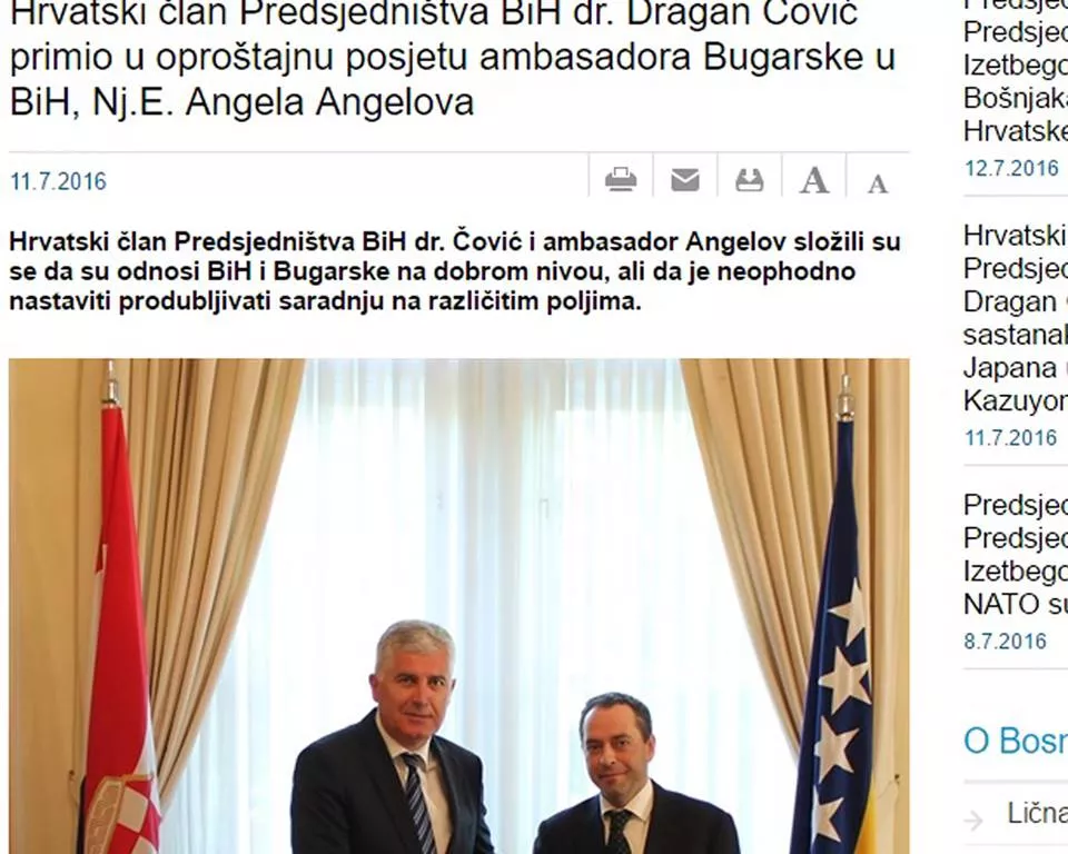 Čović je sretan put i uspješan nastavak karijere poželio i bugarskom ambasadoru Angelu Angelovu, koji je došao baš 11. jula u oproštajnu posjetu.