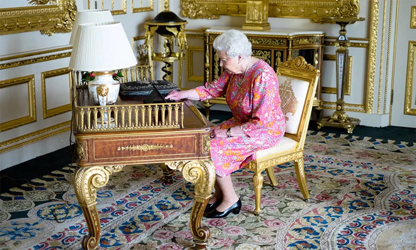 Uobičajeno dobro raspoložena, u ružičastoj haljini, kraljica je fotografisana kako tipka poruku na tabletu.