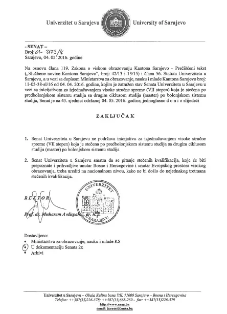 Senat Univerziteta u Sarajevu je na 43. sjednici održanoj 4. 5. 2016. godine jednoglasno zaključio da ne podržava inicijativu za izjednačavanjem visoke stručne spreme (VII stepen) koja je stečena po predbolonjskom sistemu studija sa drugim ciklusom studija (master) po bolonjskom sistemu studija. Senat Univerziteta u Sarajevu smatra da se pitanje stečenih kvalifikacija, koje će biti prepoznate i prihvatljive unutar Bosne i Hercegovine i unutar Evropskog prostora visokog obrazovanja, treba urediti na državnom nivou, kako ne bi došlo do nejednakog tretmana stečenih kvalifikacija.