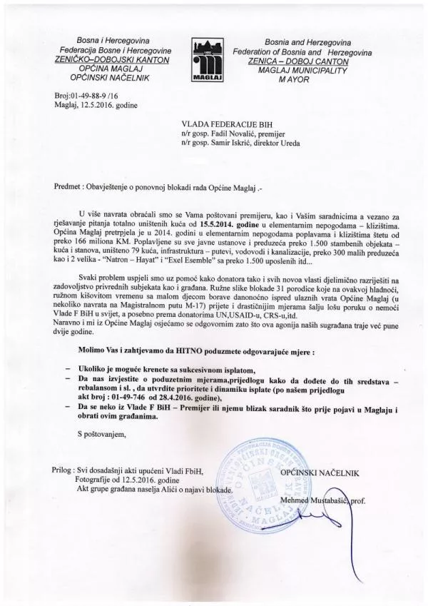 Načelnik Maglaja Mehmed Mustabašić uputio je danas pismo premijeru Vlade FBiH Fadilu Novaliću i njegovom šefu kabineta Samiru Iskriću u kojem se navodi da Vlada FBiH šalje lošu sliku u svijet jer ne rješava problem 31 porodice koje su nakon poplava u maju 2014. godine ostale bez krova nad glavom, piše bh. novinska agencija Patria.