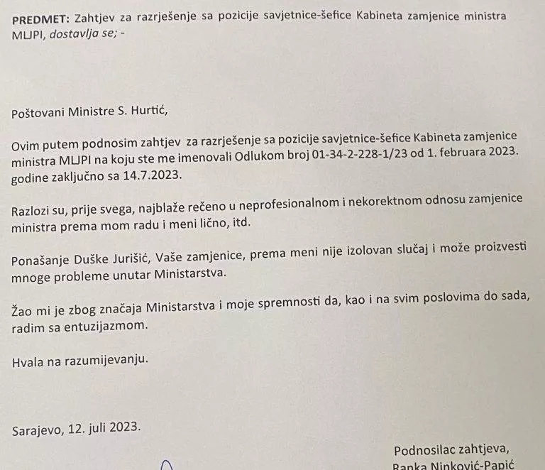 “Razlozi su, prije svega, najblaže rečeno u neprofesionalnom i nekorektnom odnosu zamjenice ministra prema mom radu i meni lično, itd. Ponašanje Duške Jurišić, Vaše zamjenice, prema meni nije izolovan slučaj i može proizvesti mnoge probleme unutar Ministarstva”, obrazložila je svoju ostavku Ranka Ninković-Papić.