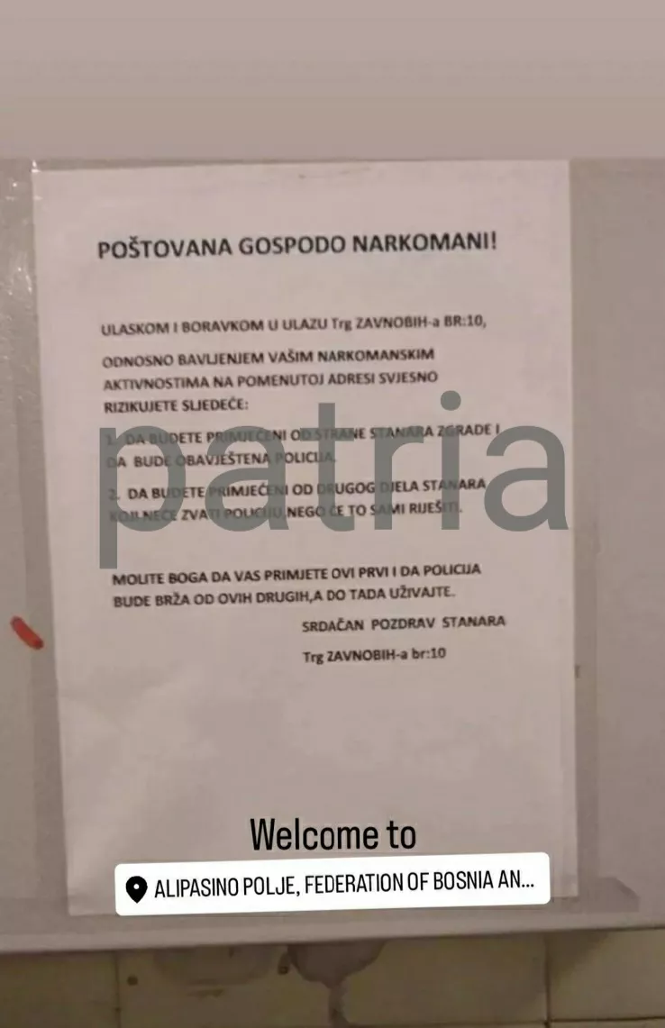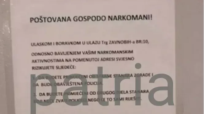 "Poštovana gospodo narkomani, ulaskom i boravkom u ulazu Trg ZAVNOBiH-a br. 10, odnosno bavljenjem vašim narkomanskim aktivnostima na pomenutoj adresi, svjesno rizikujete sljedeće: