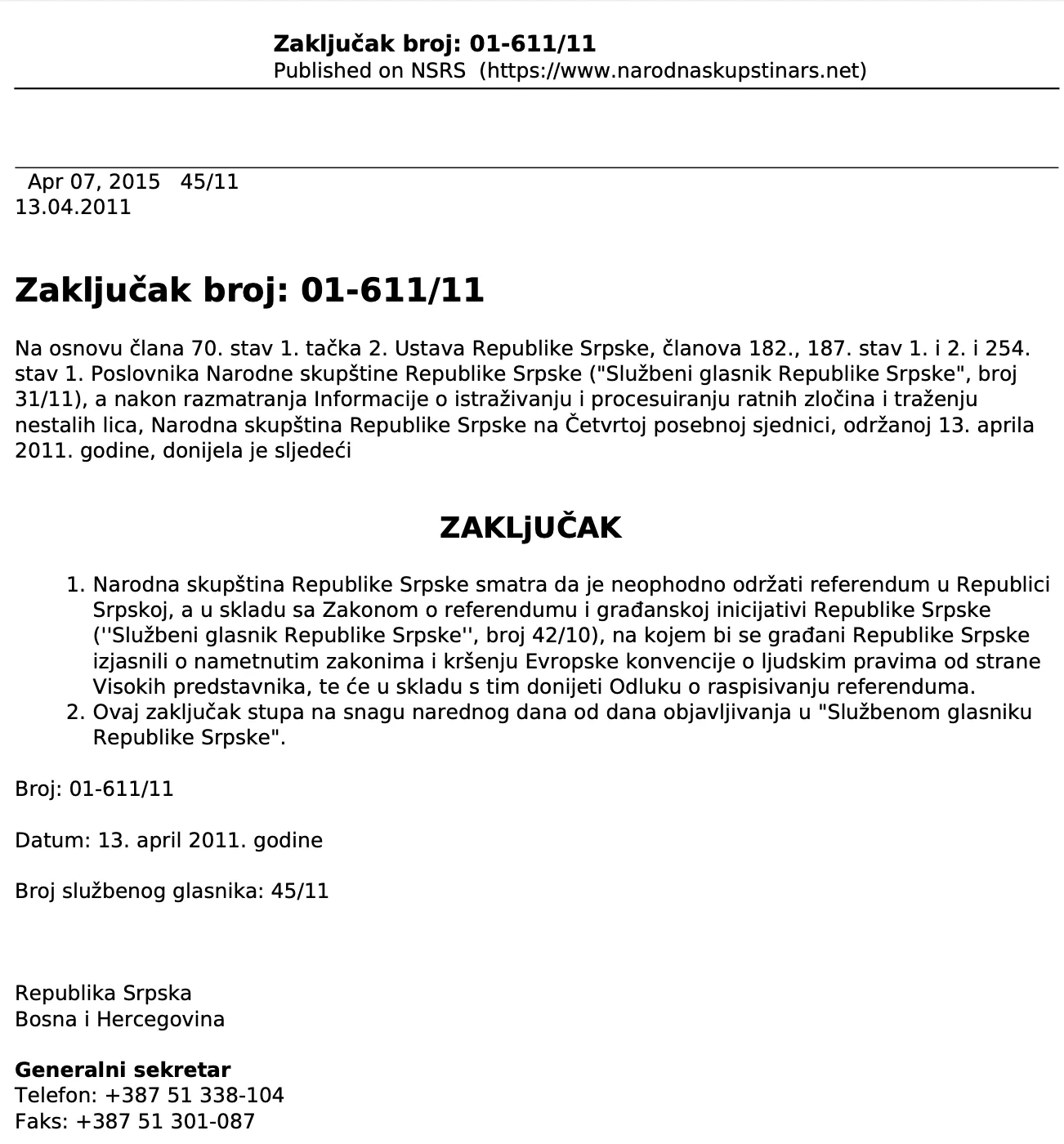 "Narodna skupština Republike srpske podržala je u srijedu navečer inicijativu predsjednika Rs Milorada Dodika da se u ovom bh. entitetu održi referendum o Sudu i Tužilaštvu BiH", glasila je vijest objavljena 14. aprila 2011. godine.