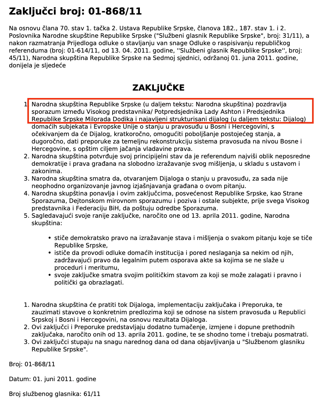 "Narodna skupština Republike srpske (u daljem tekstu: Narodna skupština) pozdravlja sporazum između visokog predstavnika/potpredsjednika Lady Ashton i predsjednika Republike srpske Milorada Dodika i najavljeni strukturirani dijalog (u daljem tekstu: Dijalog) domaćih subjekata i Evropske unije o stanju u pravosuđu u Bosni i Hercegovini, s očekivanjem da će Dijalog, kratkoročno, omogućiti poboljšanje postojećeg stanja, a dugoročno, dati preporuke za temeljnu rekonstrukciju sistema pravosuđa na nivou Bosne i Hercegovine, s opštim ciljem jačanja vladavine prava.