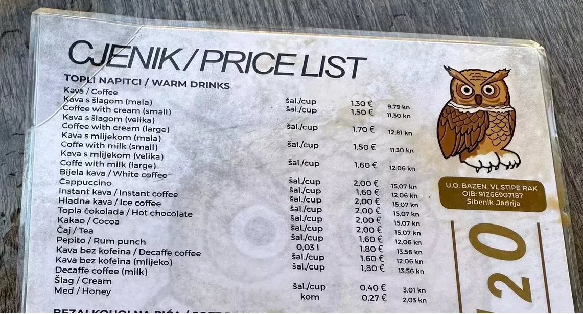 Kako se može vidjeti, cijena kafe u ovom kafiću je 1,30 eura, cappucino košta 1,60, Coca Cola 2,40, dok veliko točeno pivo košta 3 eura.