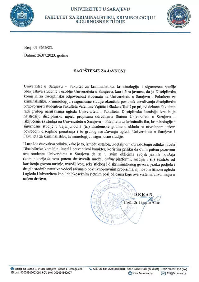 (Patria) - Fakultet za kriminalistiku, kriminologiju i sigurnosne studije UNSA izdao je saopćenje u kojem je obavijestio studente i uposlenike Univerziteta u Sarajevu, te širu javnost da je Disciplinska komisija za disciplinsku odgovomost studenata na Univerzitetu u Sarajevu - Fakultetu za kriminalistiku, kriminologiju i sigurnosne studije okončala postupak utvrđivanja disciplinske odgovornosti studentica Fakulteta Valentine Vujičić i Slađane Todić po prijavi dekana Fakulteta, kako navode, radi grubog narušavanja ugleda Univerziteta i Fakulteta.