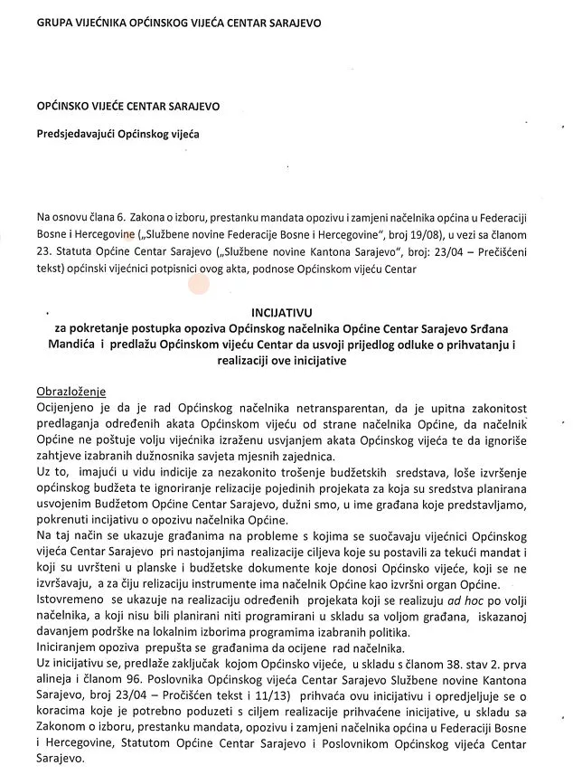 (Patria) - Današnji dnevni red Općinskog vijeća Centar dopunjen je inicijativom koju je potpisalo 16 vijećnika a kojom se traži opoziv načelnika općine Srđana Mandića (Naša stranka).