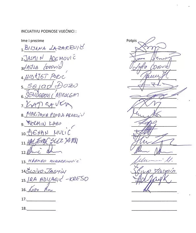 Vijećnici Naroda i pravde, SDA, SBB i nezavisni vijećnici prikupili su 16 potpisa kako bi ova inicijativa bila pokrenuta.