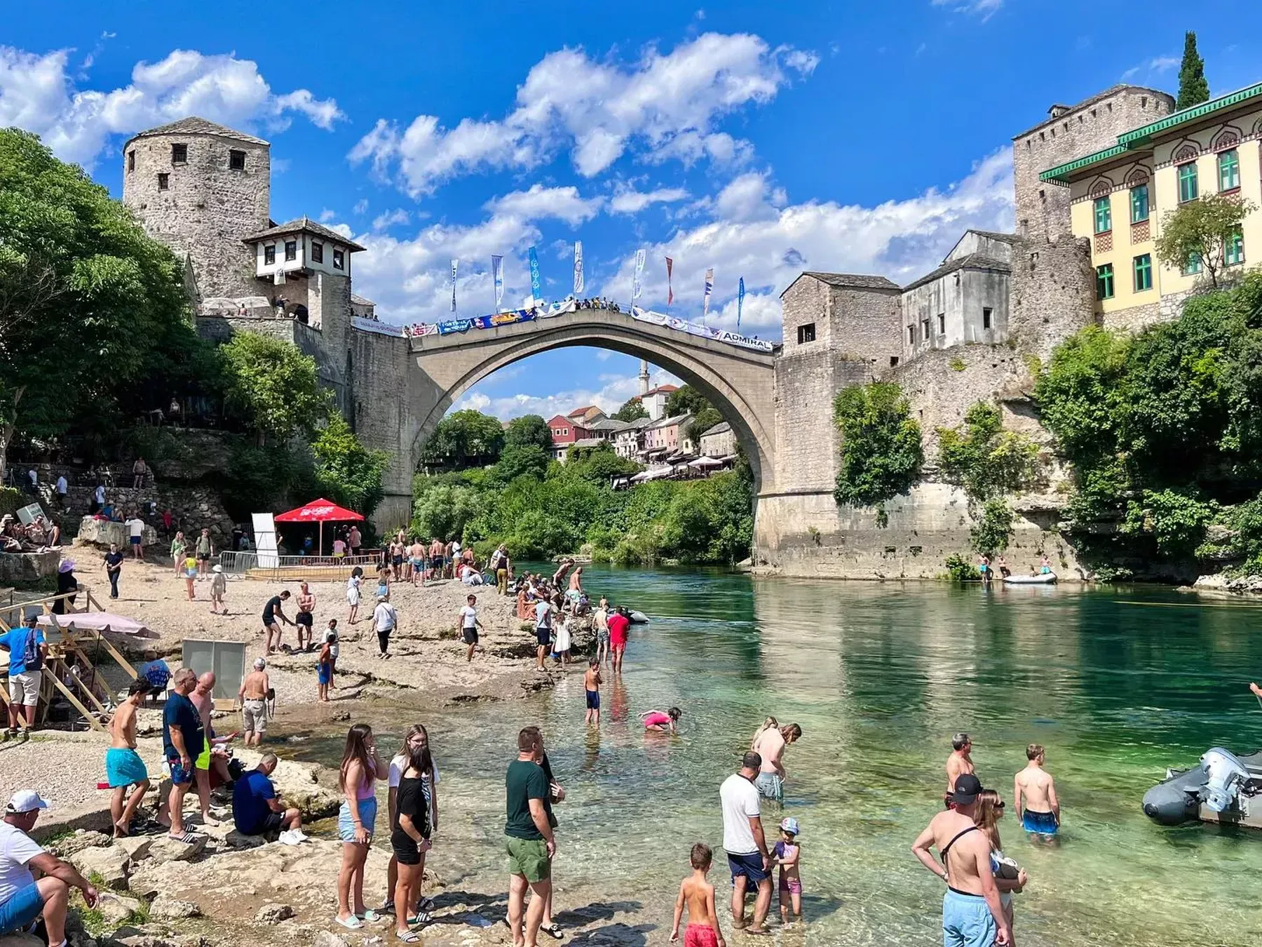 (Patria) - Tradicionalni 457. skokovi sa Starog mosta okupili su brojne turiste. Iako je temperatura zraka u Mostaru 34 stepena, publika će s obala Neretve pratiti skokove na noge i na glavu (lasta) od 16 sati s prijenosom na Face TV.