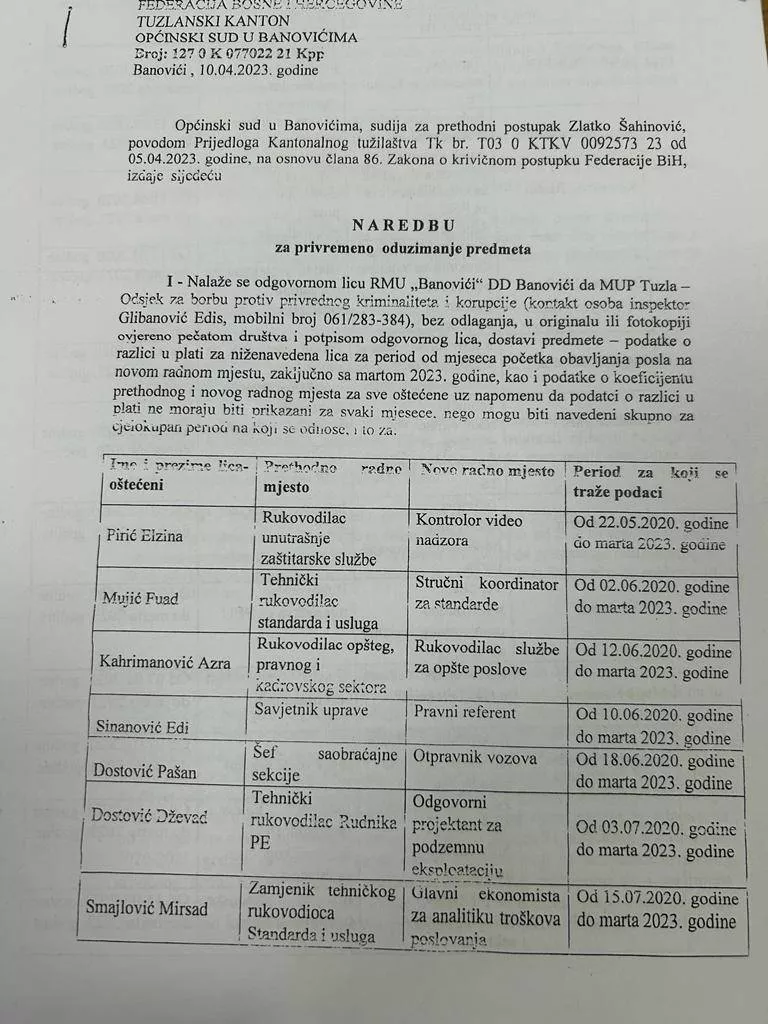 A evo o čemu se radi. U maju 2020. godine Fadil Kudumović je imenovan za v.d. direktora RMU Banovići, čime je, faktički, Mirsad Kukić izgubio kontrolu nad tim rudnikom. Kudumović je odmah smijenio Kukićeve kadrove među kojima su bili Elzina Pirić, Pašan Dostović, Rasim Dostović i drugi kadrovi PDA. Odmah nakon smjene tih kadrova, podnesena je krivična prijava protiv v.d. direktora Fadila Kudumovića (SDA). Na osnovu te prijave, MUP TK je 20. oktobra 2021. godine podnio izvještaj o počinjenom krivičnom djelu protiv Fadila Kudumovića zbog sumnje da je, otkazima ugovora o radu oštetio 21 osobu. Kantonalno tužilaštvo Tuzla je, potom, “formiralo” predmet, a da bi tek u aprilu 2023. godine zatražili od Općinskog suda u Banovićima izdavanje naredbe za privremeno oduzimanje predmeta koji se odnose na ovaj slučaj.