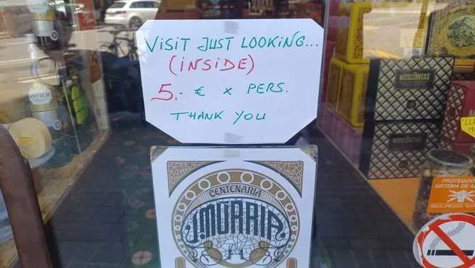 "Razgledavanje dućana 5€ po osobi, hvala", tako piše na natpisu na ulazu u Queviures Murria, historijski dućan koji prodaje delikatese u Barceloni, te posluje gotovo 130 godina (otvoren 1898. godine).