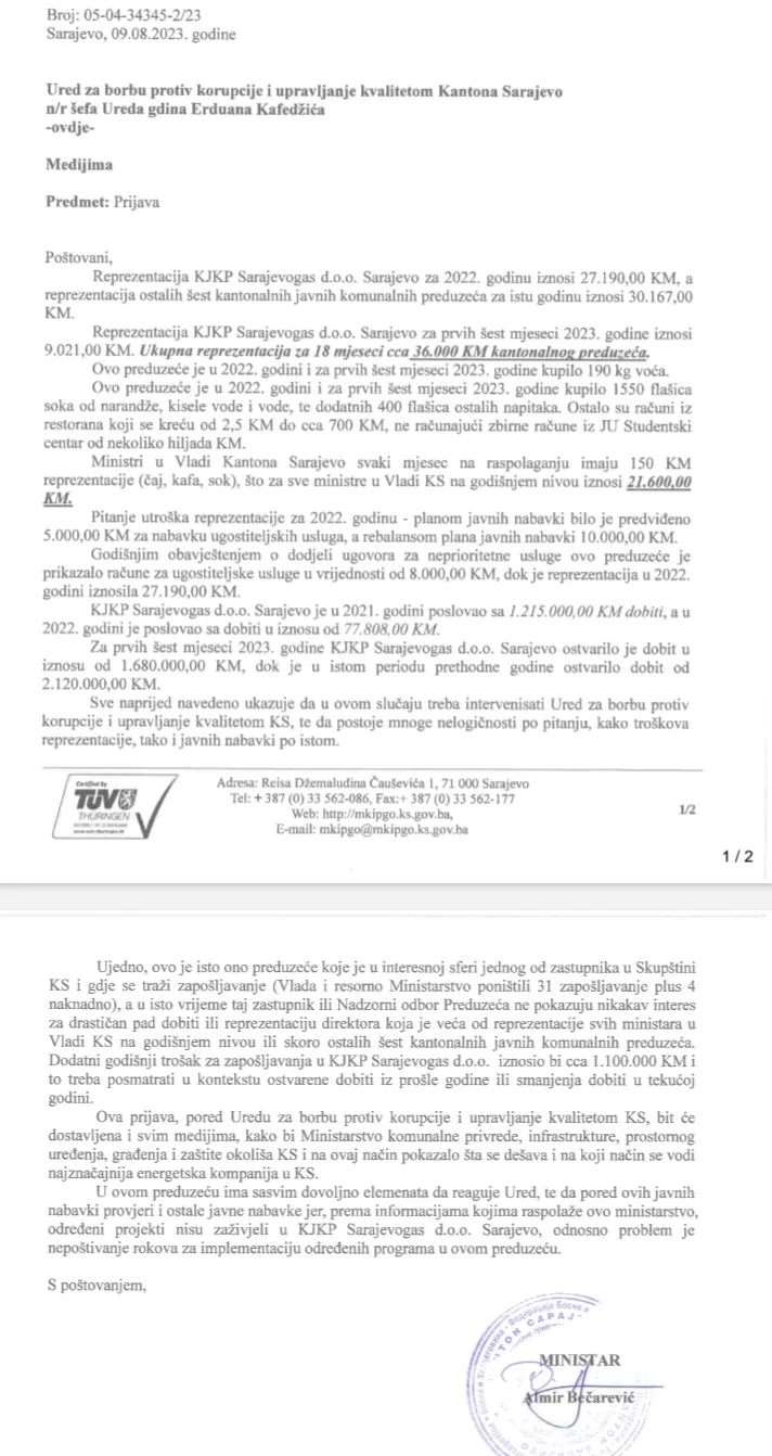 (Patria) - Ministar komunalne privrede, infrastrukture, prostornog uređenja, građenja i zaštite okoliša Almir Bečarević uputio je prijavu Uredu za borbu protiv korupcije i medijima o troškovima reprezentacije u javnom kantonalnom preduzeću Sarajevogas.