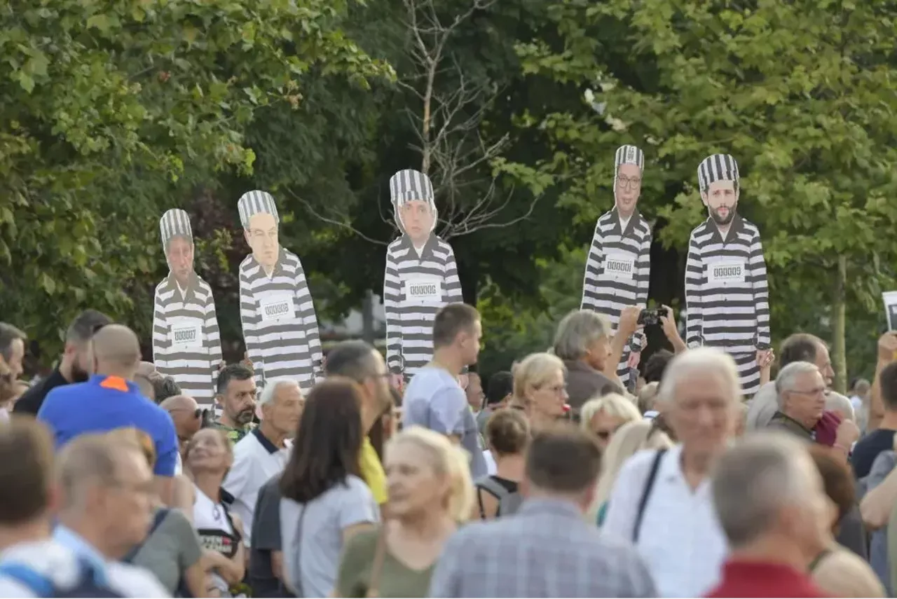 Okupljeni su mirnom šetnjom došli do zgrade Vlade. Dio učesnika protesta ostavio je lutke sa likovima Vučića, Šapića i Gašića u robijaškoj odjeći.
