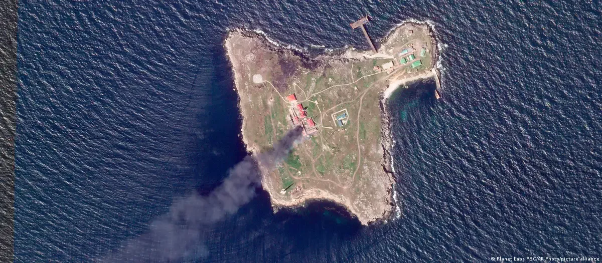 Jedan od njih je radio uzvratio „Ruski ratni brod, idi i j... se.“ Fraza je postala nacionalni slogan, prikazana na ukrajinskim bilbordima, majicama, a na kraju i poštanskoj marki. Strateško ostrvo gleda na morske puteve do Odese, glavne ukrajinske crnomorske luke. 14. aprila 2022. godine dvije ukrajinske rakete pogodile su „Moskvu“, najveći ratni brod potopljen u borbama u posljednjih 40 godina. Rusija kaže da je jedan mornar poginuo u nesreći.